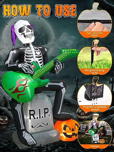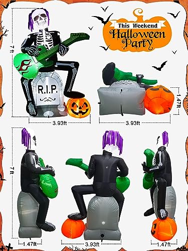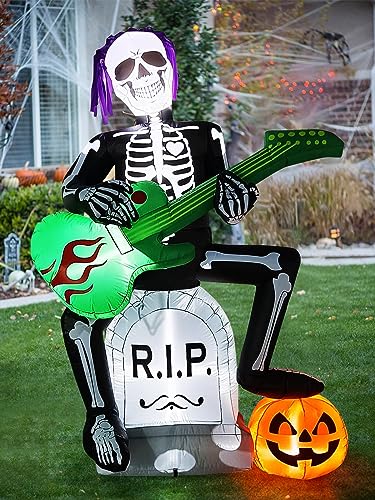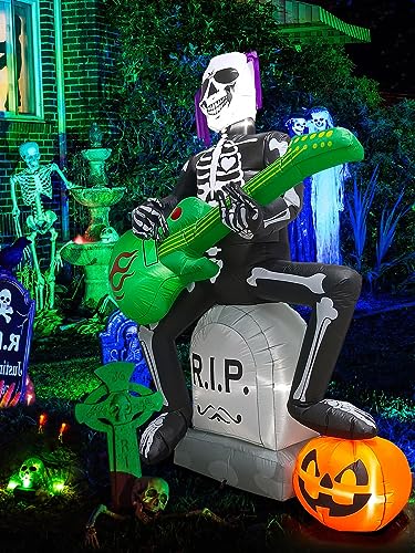 ### 7 Fuß Halloween Aufblasbarer Skelett Spielt Gitarre mit Grabstein Kürbis