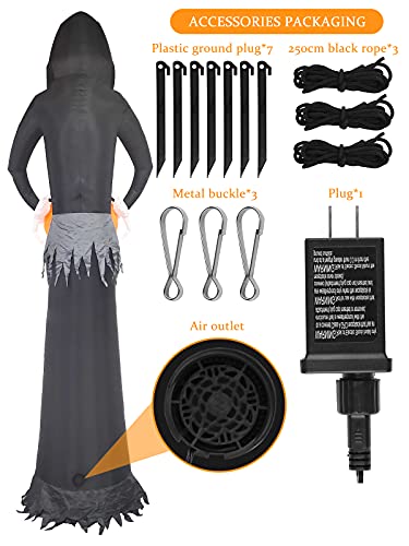 In diesem schaurigen Paket finden Sie einen 270 cm hohen Halloween aufblasbaren Deko-Geist, der mit einem eingebauten Gebläse und strahlenden LED-Lichtern ausgestattet ist. Aber das ist noch nicht alles! Sie erhalten auch 3 Metallschnallen, 7 Kunststoff-Erdungsstopfen und 3 zeilen à 250 cm schwarzen Seilen, die dafür sorgen, dass Ihr Geist auch bei windigem Wetter standhaft bleibt. Schließlich wollen wir nicht, dass unser Geist plötzlich auf einen ungewollten Ausflug in die Nachbarschaft geht!