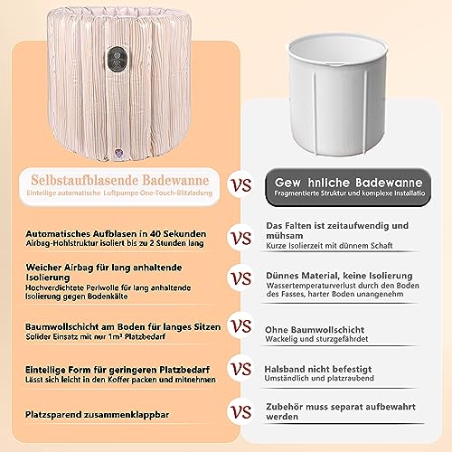Mit nur einem Druck auf den orangefarbenen Aufblasknopf verwandelt sich die Badewanne in nur 40 Sekunden in eine geräumige und komfortable Oase. Sie müssen nicht mehr aufwendig eine traditionelle Badewanne installieren oder auf den nächsten Wellnessbesuch warten. Diese aufblasbare Badewanne ist tragbar und kann überallhin mitgenommen werden.
