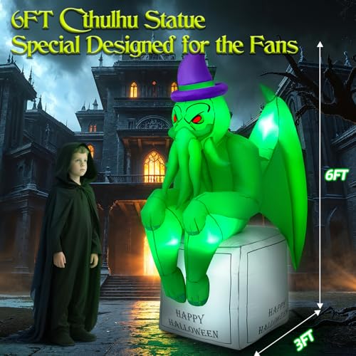 Ein besonderes Highlight ist das eingebaute, superhelle LED-Licht, das Ihre Haustür oder Ihren Vorgarten geheimnisvoll beleuchtet. Wenn die Sonne untergeht, wird die aufblasbare Cthulhu-Statue durch die Lichter noch lebendiger und verwandelt Ihre Halloween-Dekoration in ein schauriges Schauspiel.