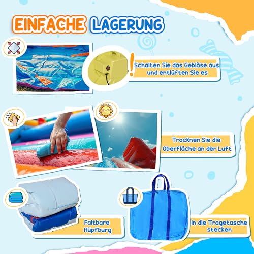 Wer hat schon Zeit, stundenlang mit dem Aufbauen von Spielgeräten zu verbringen? Mit der im Lieferumfang enthaltenen hochwertigen 750 W-Luftpumpe ist die Hüpfburg in nur 2 Minuten aufgeblasen! Ja, Sie haben richtig gehört – in der Zeit, in der Sie einen Kaffee aufbrühen, können Ihre Kinder schon im Wasser planschen. Und wenn der Spaß vorbei ist, lässt sich die Hüpfburg ebenso schnell wieder entleeren und in der praktischen Tragetasche verstauen. So bleibt mehr Zeit für die wichtigen Dinge im Leben – wie das Grillen von Würstchen für die hungrigen Abenteurer!