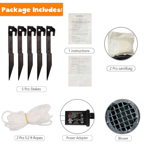 Um sicherzustellen, dass Ihre aufblasbare Vogelscheuche auch bei windigem Wetter an Ort und Stelle bleibt, sind im Set fünf Heringe und zwei Krawattenschnüre enthalten. Diese stabilen Hilfsmittel garantieren, dass Ihre Dekoration sicher am Boden verankert ist. Zudem sind zwei eingebaute Sandsäcke an der Basis der Vogelscheuche angebracht, die zusätzlichen Halt geben. Bitte beachten Sie jedoch, dass das 210T Polyestergewebe wasserdicht ist, während das Gebläse und der Adapter unbedingt vor Regen oder Wasser geschützt werden sollten.