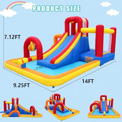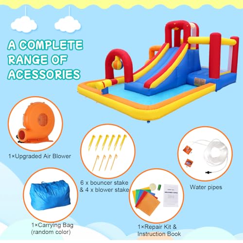 Die aufblasbare Wasserrutsche ist das perfekte Spielzeug für alle Kinder, die Abenteuer und Abwechslung lieben. Der 10-in-1-Wasserrutschen-Park kombiniert gleich mehrere beliebte Spielbereiche. Kinder können aus zwei Rutschen wählen und sich in zwei Planschbecken erfrischen. Ein Trampolinbereich sorgt für zusätzliche Sprünge, während eine Wasserpistole sowie ein Boxball für noch mehr Action und Spaß sorgen. Die integrierte Kletterwand und der Basketballkorb bieten darüber hinaus viele Möglichkeiten für spielerische Herausforderungen.
