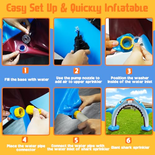 Die beeindruckenden Maße von 335,3 x 210,8 cm sorgen dafür, dass der Hai sowohl auffällig als auch funktional ist. Der Aufbau des Sprinklers ist denkbar einfach. Sie benötigen lediglich eine Luftpumpe (nicht im Lieferumfang enthalten). Nachdem der Hai aufgeblasen ist, wird er mit dem Schlauch verbunden, und die Basen werden mit Wasser gefüllt, um zusätzliche Stabilität zu gewährleisten. Das Wasser spritzt dann aus den geschickt versteckten Löchern unter dem Bogen hervor und sorgt für einen spritzigen Spaß.